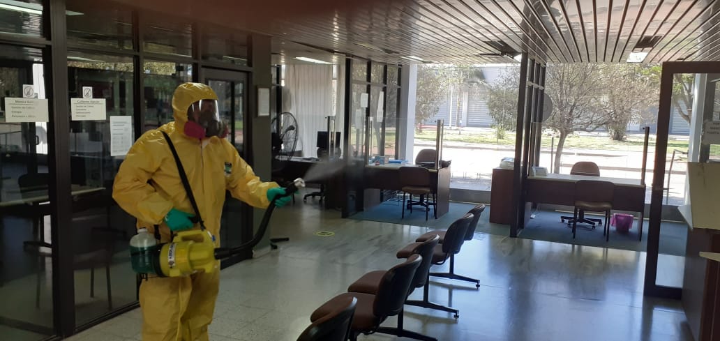 Este sábado, 10 de octubre, se llevó a cabo una nueva desinfección de las instalaciones de Bv. 50 y 9 con amonio cuaternario de quinta generación.